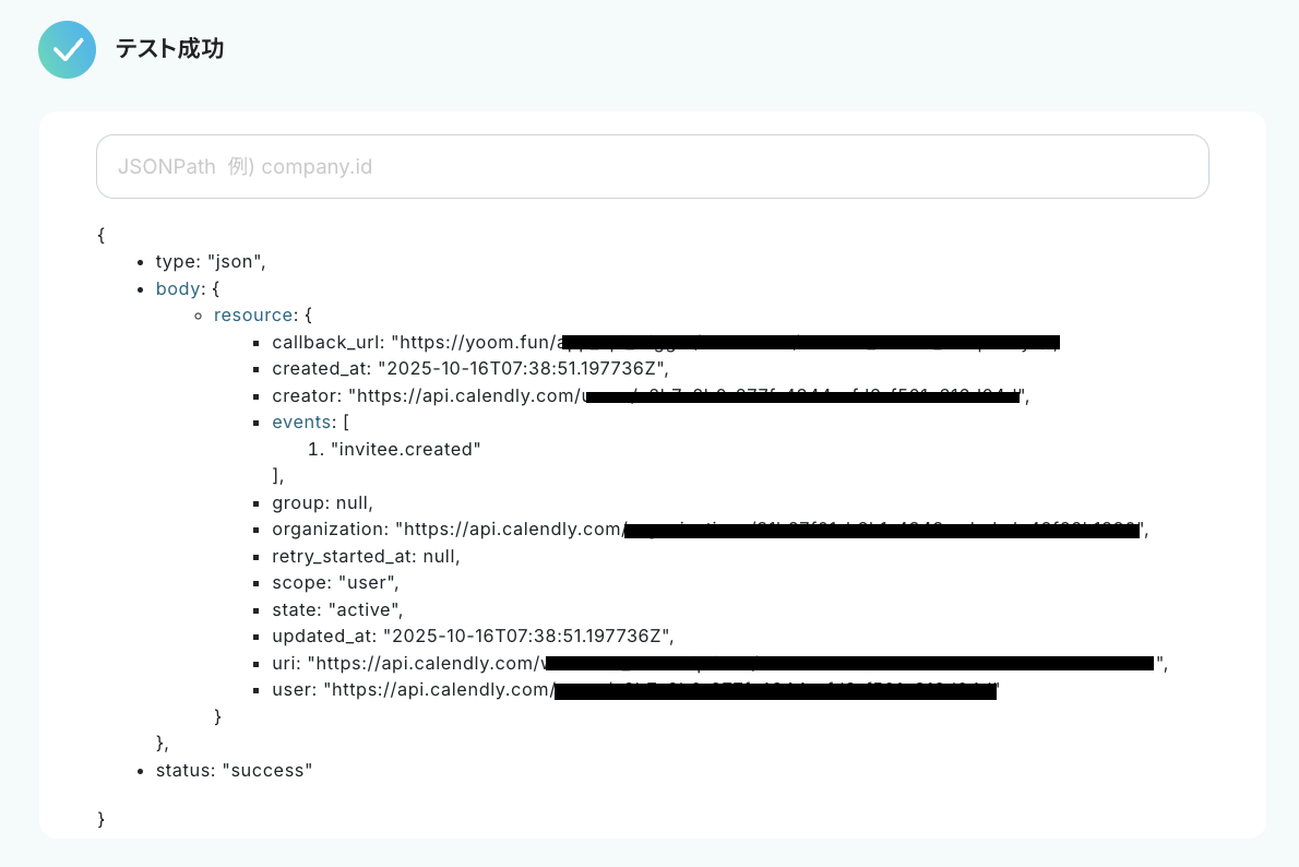 設定が完了したら「テスト」をクリックし、YoomとCalendlyのWebhookが連携できているかを確認します。