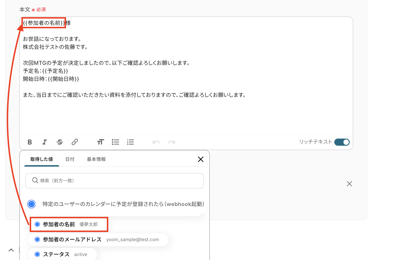「お世話になっております。」など、毎回同じ文章を使用する定型的なテキストは直接入力し、「参加者の名前」や「開始日時」など、Calendlyから取得した情報を引用したい部分は「取得した値」を使って設定してください。