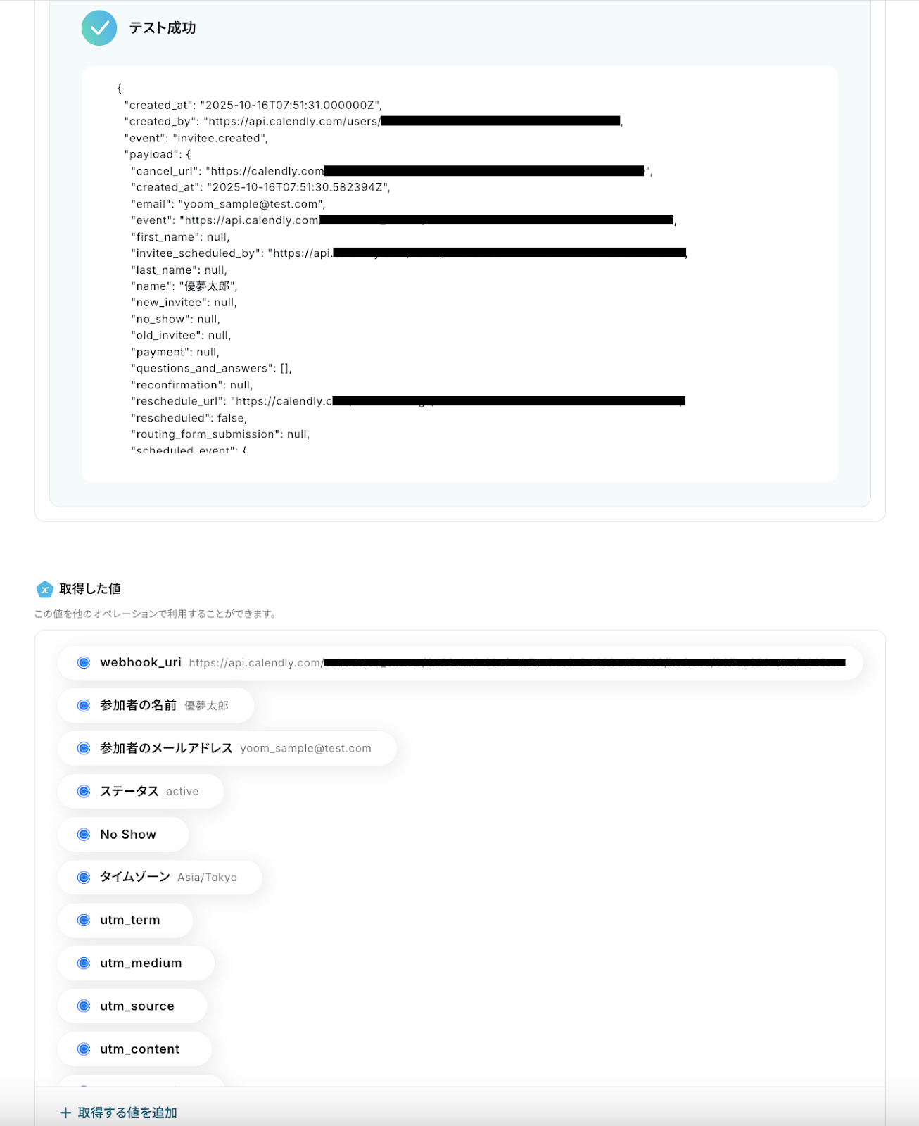 テストを成功させることで「取得した値」が取得でき、前述したように後続のオペレーション設定時に活用できます。
