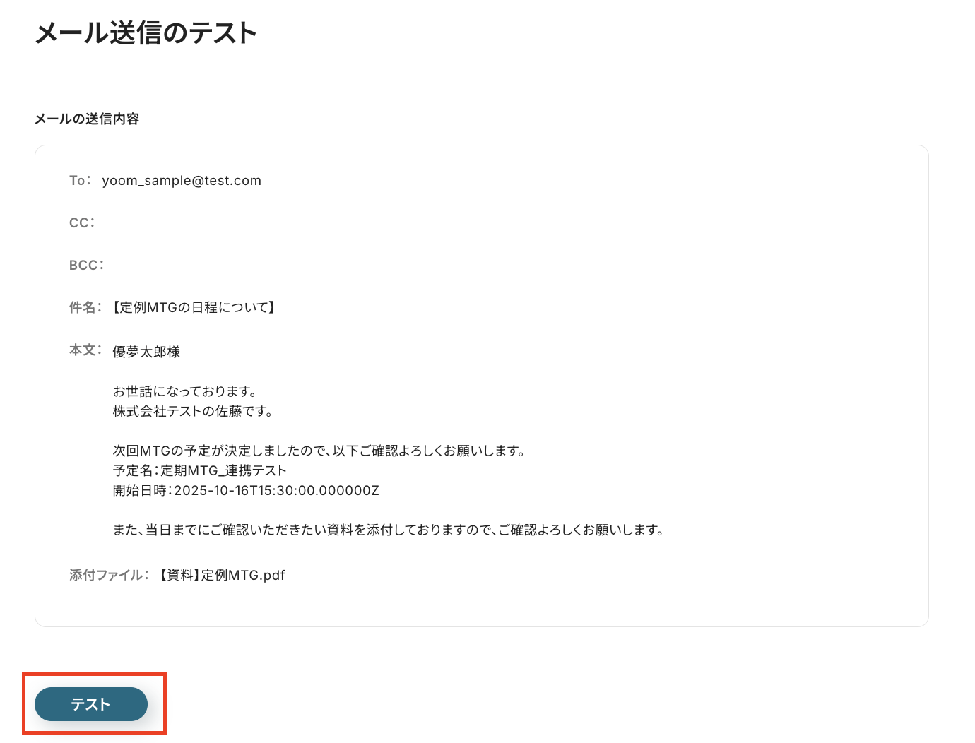 登録したらYoomの画面に戻り、「テスト」をクリックします。