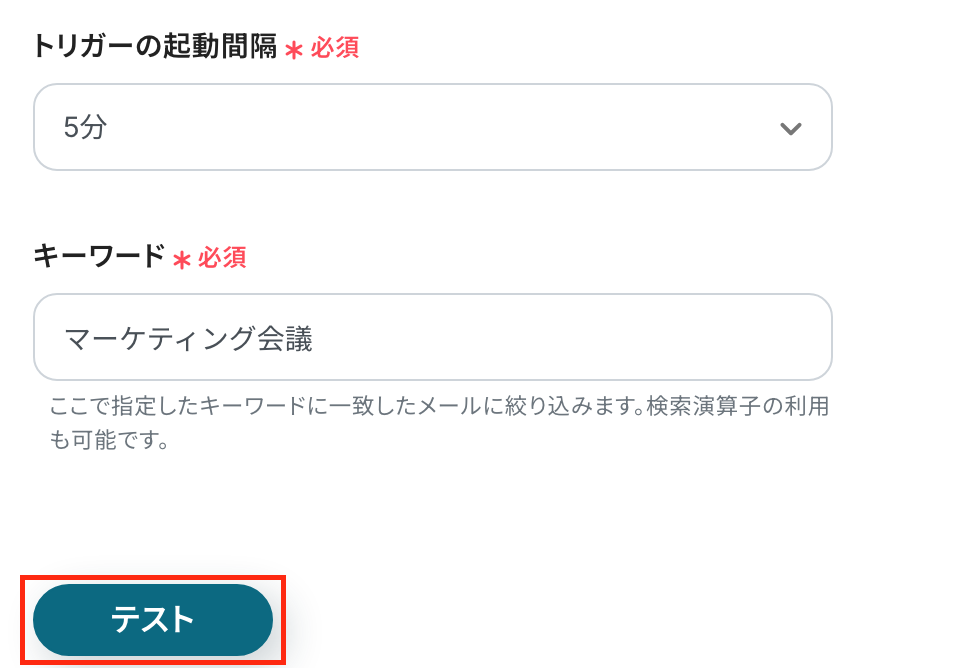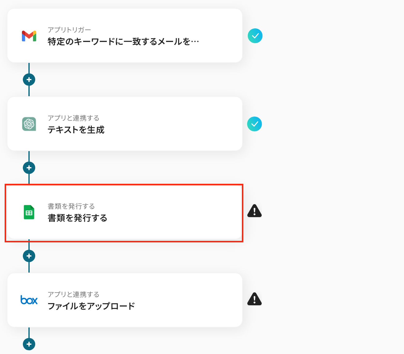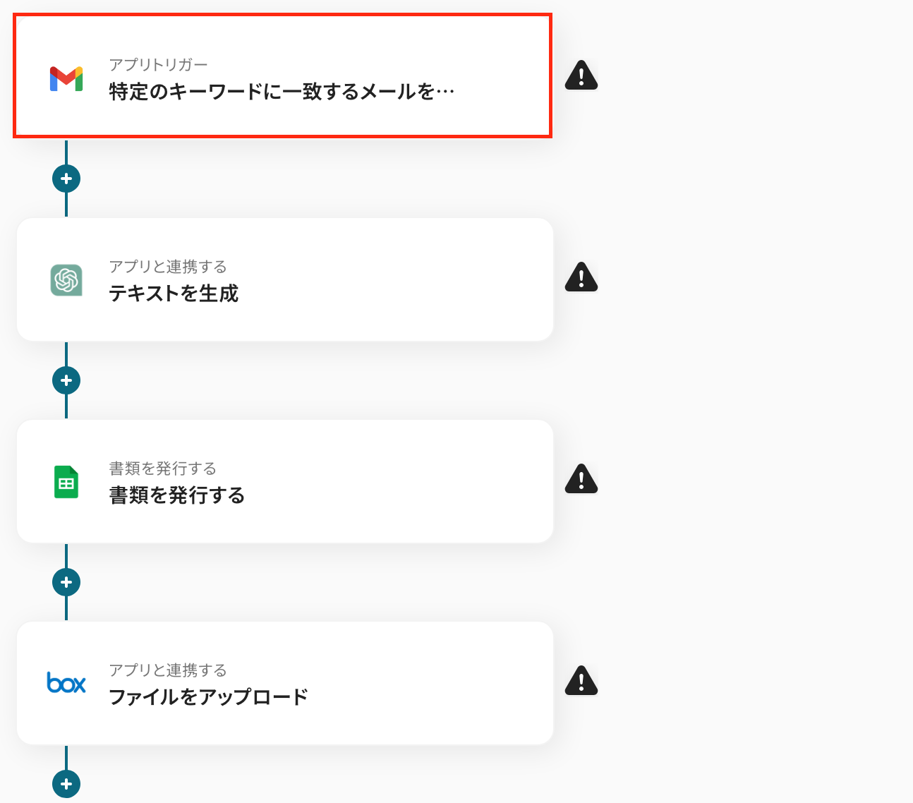 最初の設定です!ここから「Gmailで特定のキーワードを含むメールを受信したら、ChatGPTで内容を要約し結果をBoxに格納する」フローを設定していきます。