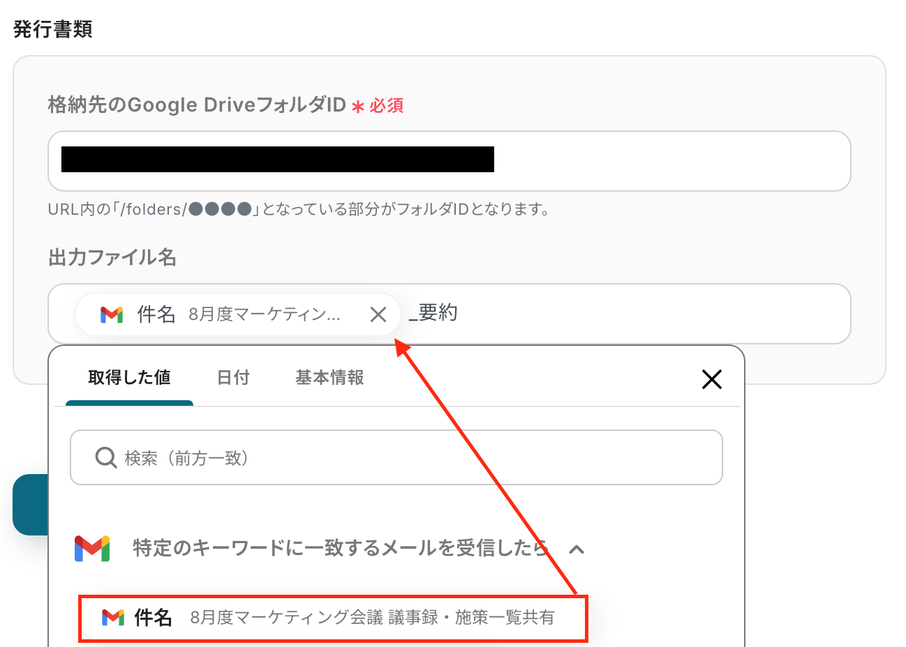 ・書類発行アクションを使用することで、Google Driveに自動でファイルが保存されます。