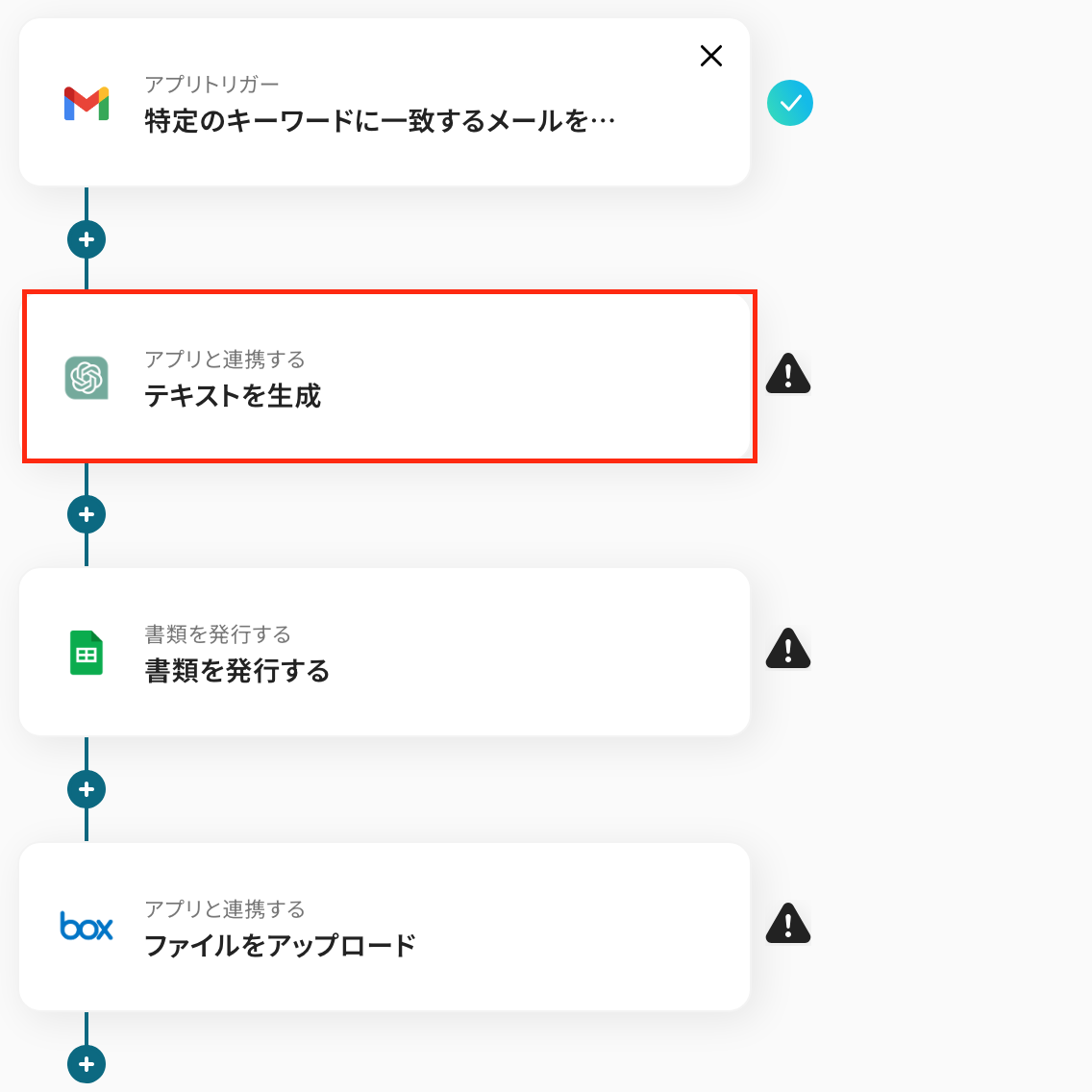 ・Gmail、ChatGPT、Google スプレッドシート、BoxのそれぞれとYoomを連携してください。