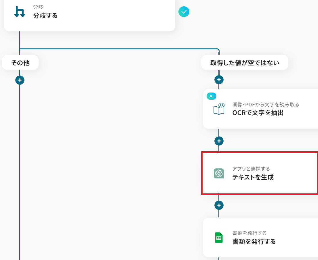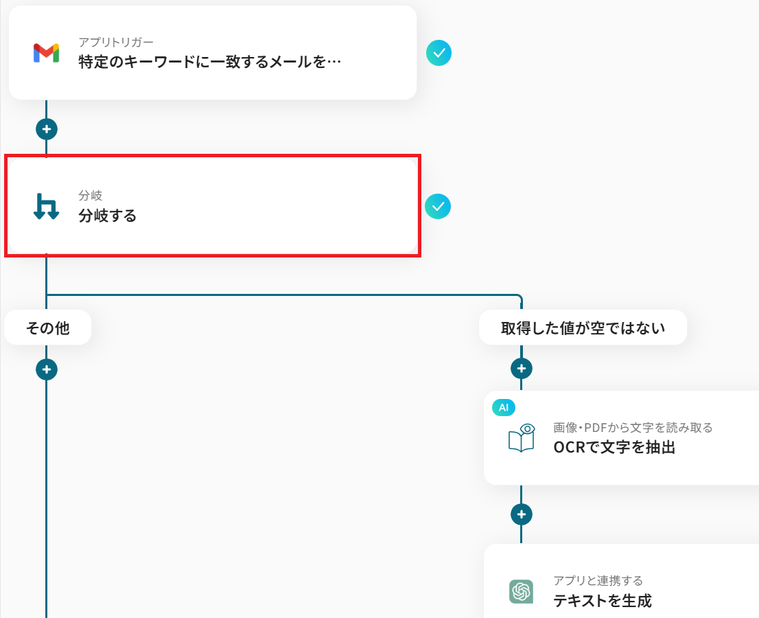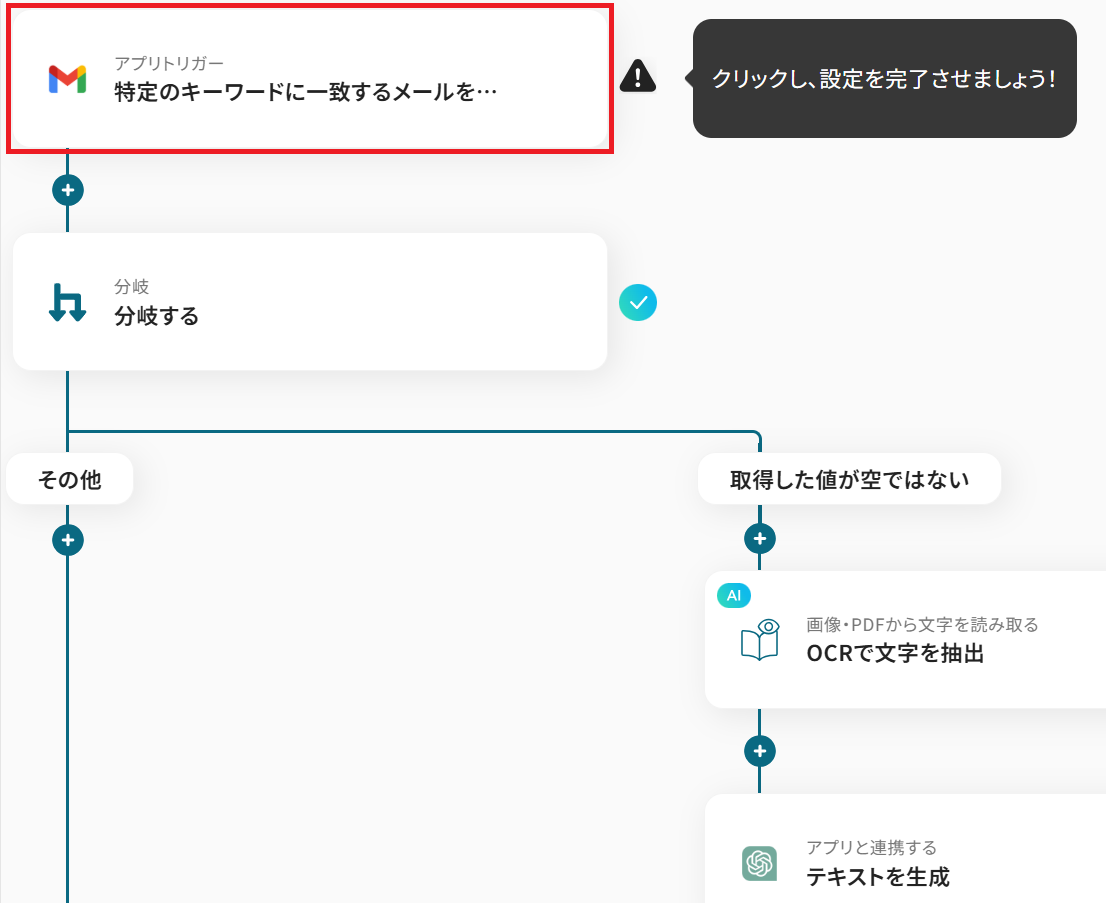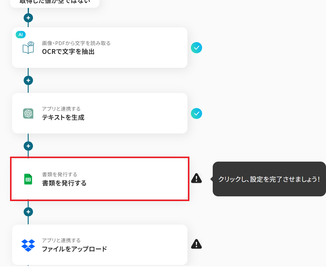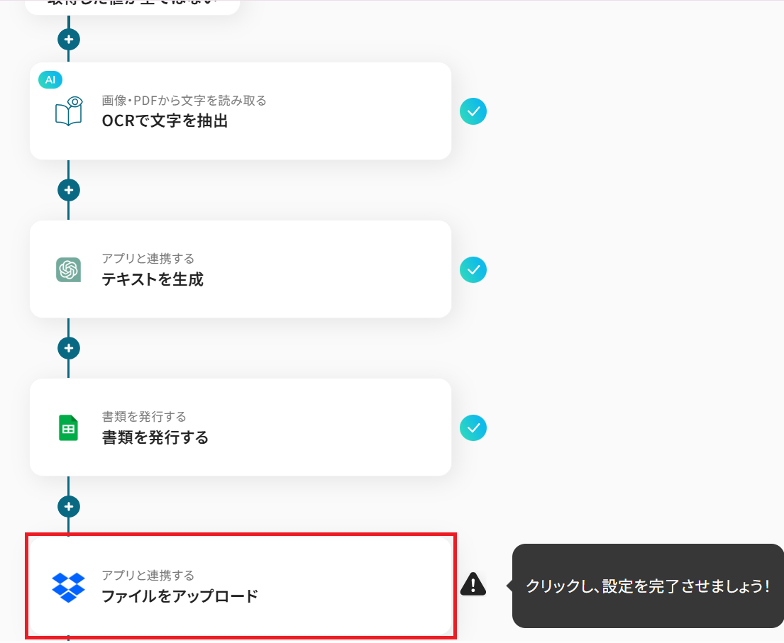 - Gmailのトリガー設定、分岐設定、OCR設定、ChatGPTのアクション設定、Google スプレッドシートのアクション設定、Dropboxのアクション設定