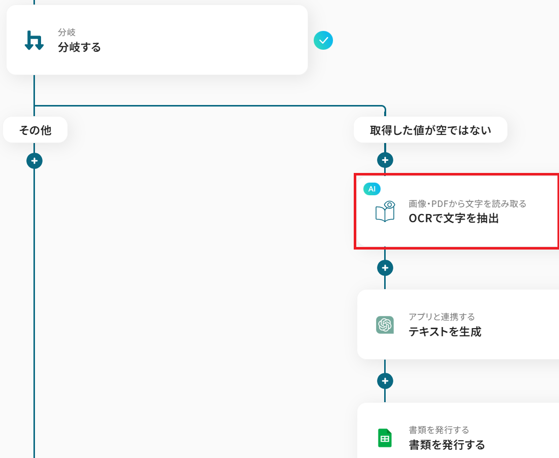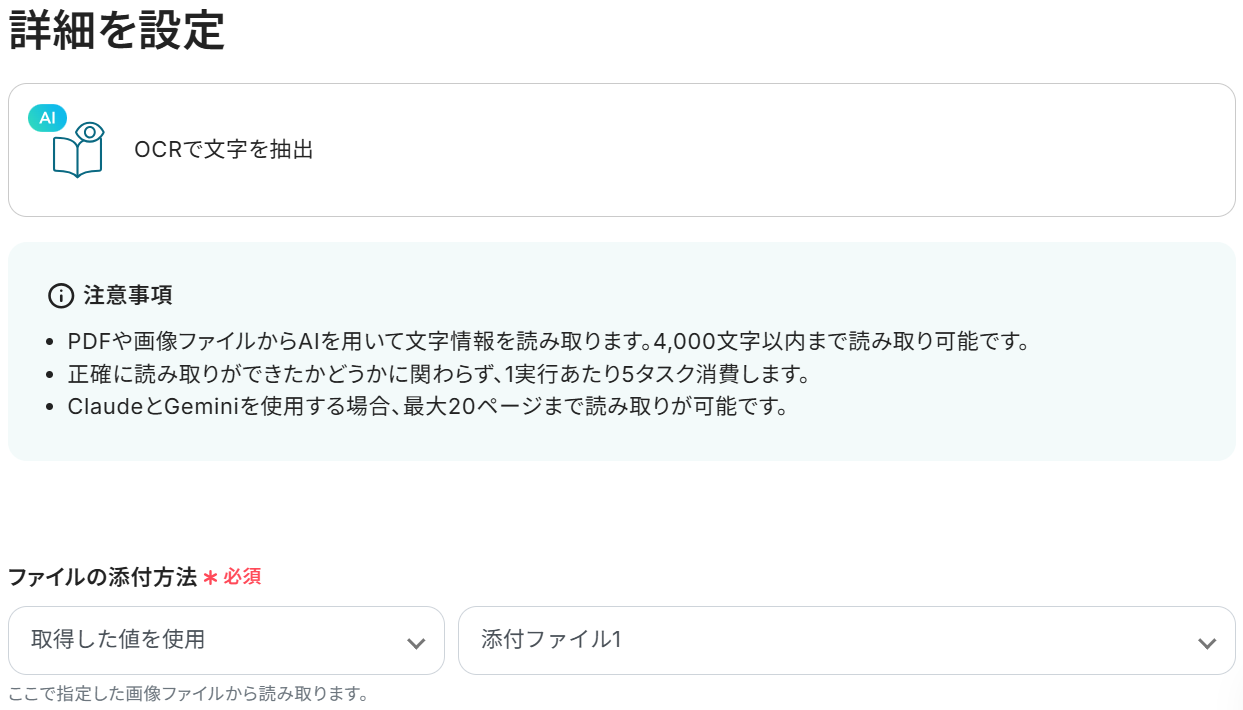 ・OCRのAIオペレーションはチームプラン・サクセスプランでのみご利用いただける機能となっております。フリープラン・ミニプランの場合は設定しているフローボットのオペレーションはエラーとなりますので、ご注意ください。