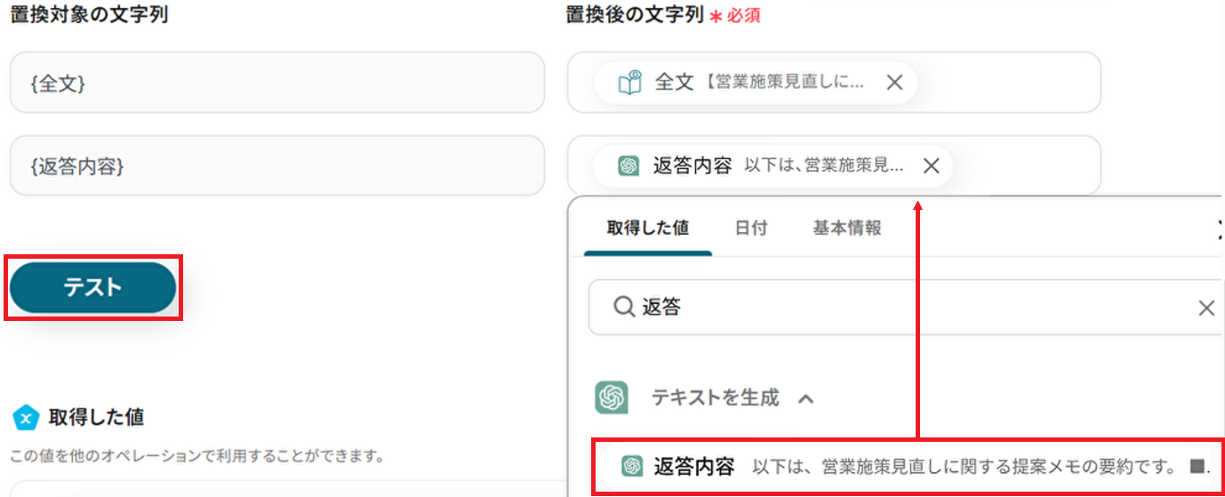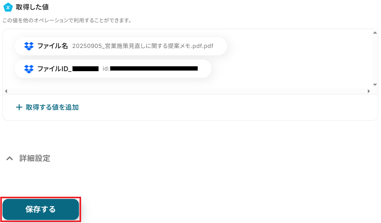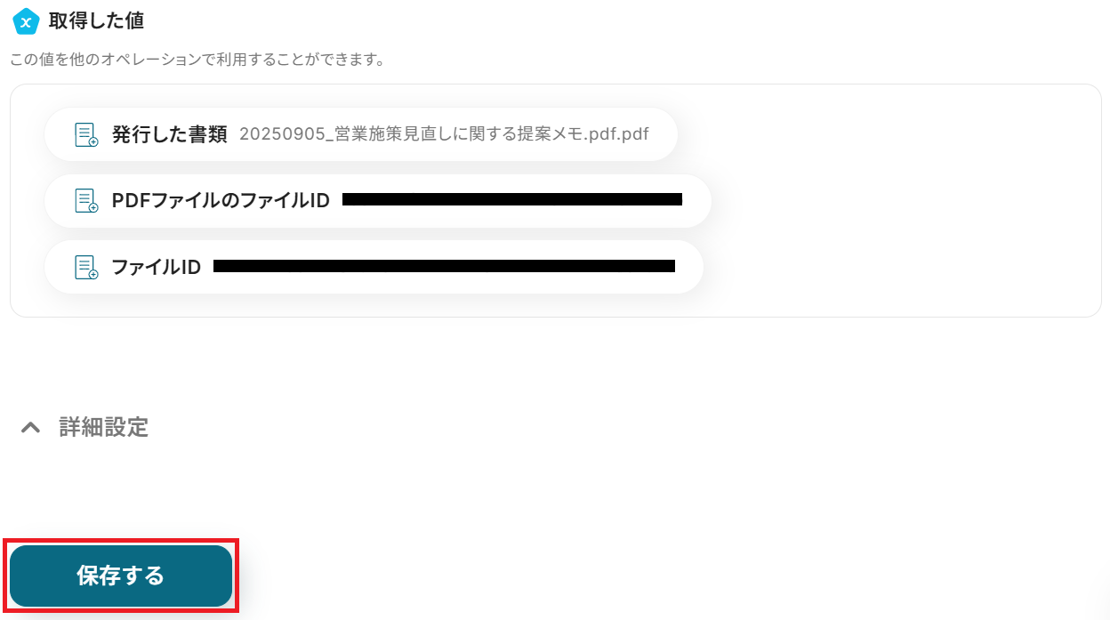 成功したら保存してください。ここで取得したアウトプットの値は次のステップで活用します。