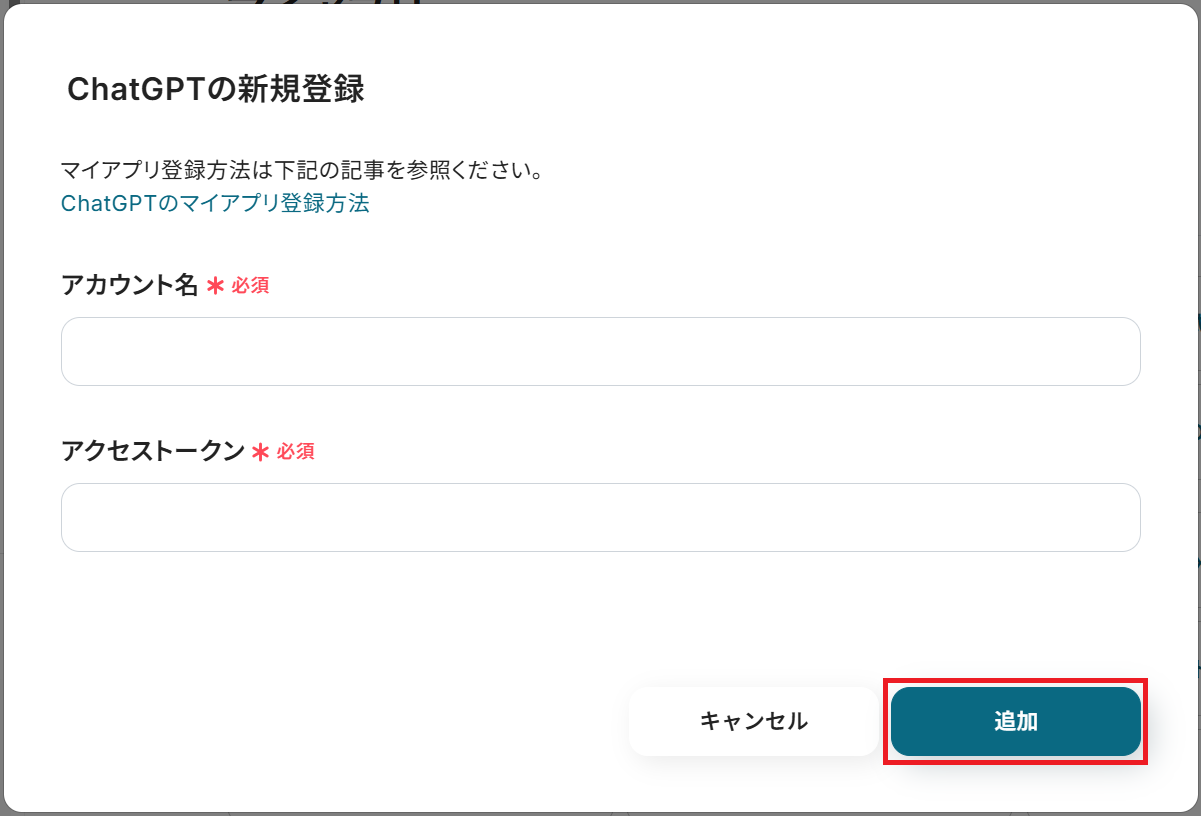 ChatGPTのマイアプリ登録方法を参考に、任意のアカウント名と取得したアクセストークンを入力し「追加」をクリックするとマイアプリ連携が完了します。