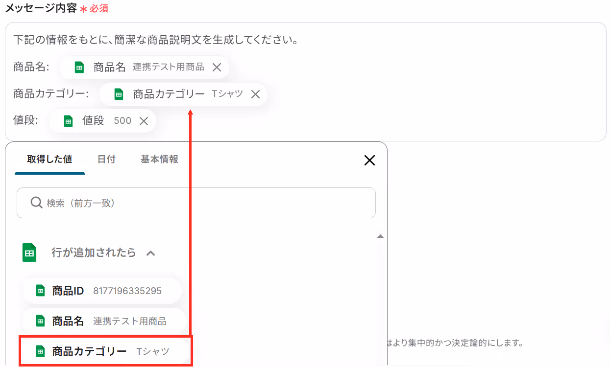 固定の文章やGoogle スプレッドシートから取得した値を組み合わせて、ご自身の業務に沿ったプロンプトを作成してください。取得した値を活用することで、固定値ではなく、トリガーが実行されるたびに最新の情報が反映できます。