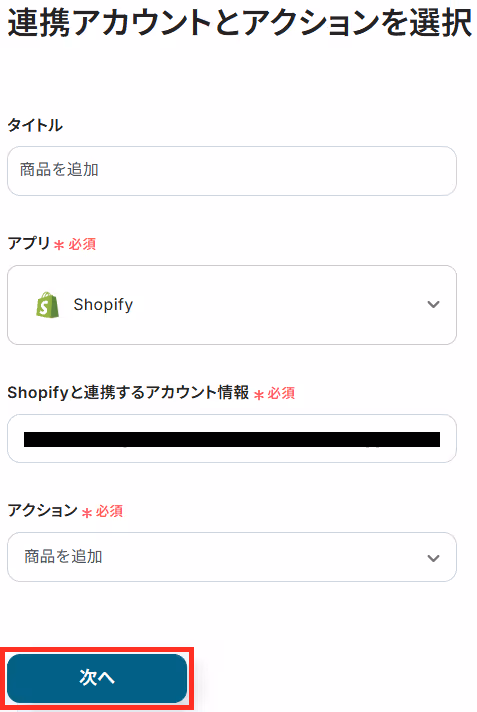ステップ3と同様、アクションは「商品を追加」のまま「次へ」をクリック。