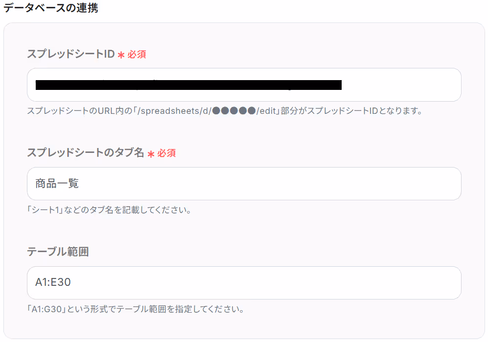 次に、ステップ3と同じ「スプレッドシートID」と「スプレッドシートのタブ名」を候補から選択します。
