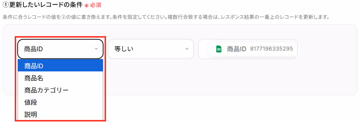 「①更新したいレコードの条件」の左の欄は用意したシートの項目名がプルダウンになっているので、一意の値が入っている項目を選択しましょう。