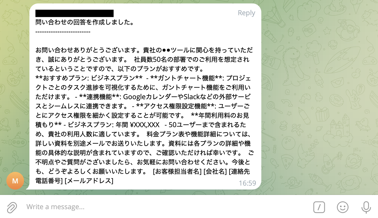 ・ChatGPTで回答案を自動生成し、Telegramで迅速にチームへ共有したい方