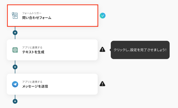 - フォームのトリガー設定と、ChatGPT、Telegramのアクション設定