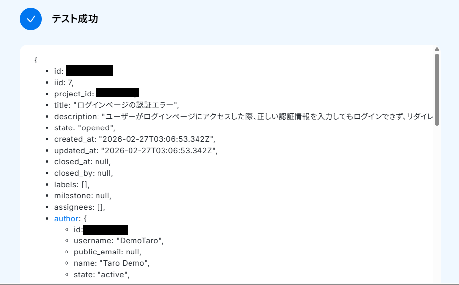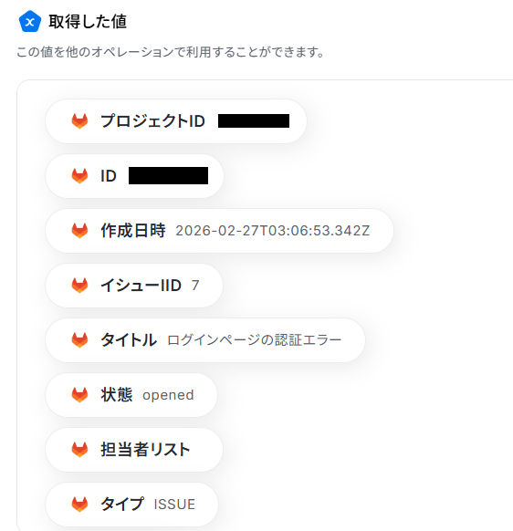 GitHubのトリガー設定では、監視対象としたいリポジトリの「オーナー名」と「リポジトリ名」を任意で設定してください。 GitLabでイシューを作成するアクションでは、同期先の「プロジェクトID」や、GitHubから引き継ぐ「課題のタイトル」「課題の説明」などを任意で設定してください。 ■注意事項