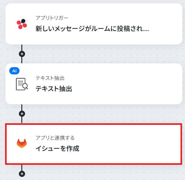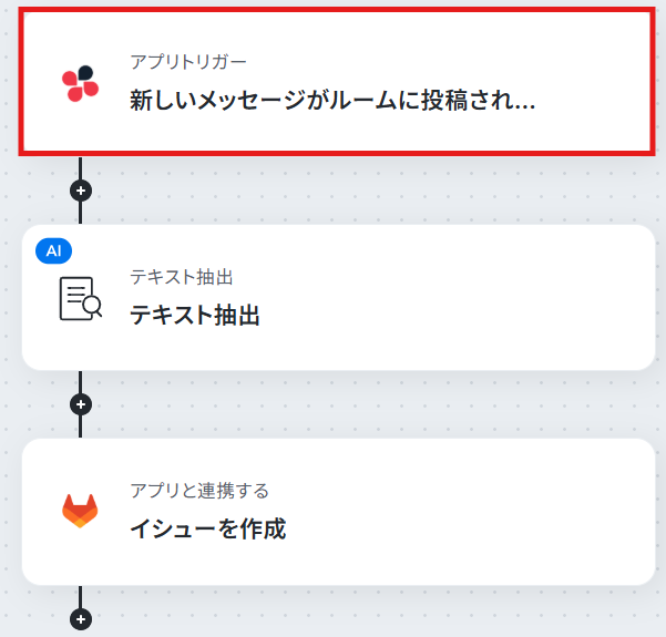 はじめに、ChatworkとGitLabをYoomと連携します。 次に、トリガーでChatworkを選択し、「新しいメッセージがルームに投稿されたら」を設定します。 次に、オペレーションでAI機能を設定し、トリガーで取得したメッセージ本文からイシューのタイトルや内容となるテキストを抽出します。 最後に、オペレーションでGitLabの「イシューを作成」アクションを設定し、前段で抽出したテキストなどを引用してイシューを作成します。 ※「トリガー」:フロー起動のきっかけとなるアクション、「オペレーション」:トリガー起動後、フロー内で処理を行うアクション■このワークフローのカスタムポイント