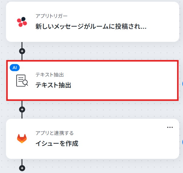 ステップ4:テキストを抽出する 次のステップでは、ChatworkのメッセージからGitLabのイシューに登録するための情報を抽出する設定を行います。 「テキスト抽出」という項目をクリックしましょう。