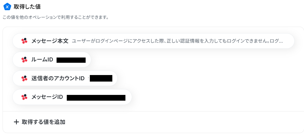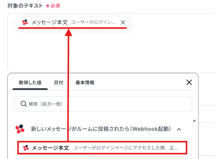 対象のテキストは、Chatworkのメッセージ本文が自動で引用できるように設定されているため確認してください。※取得した値を利用することで、トリガーが起動するたびに最新の値を自動で引用できます。