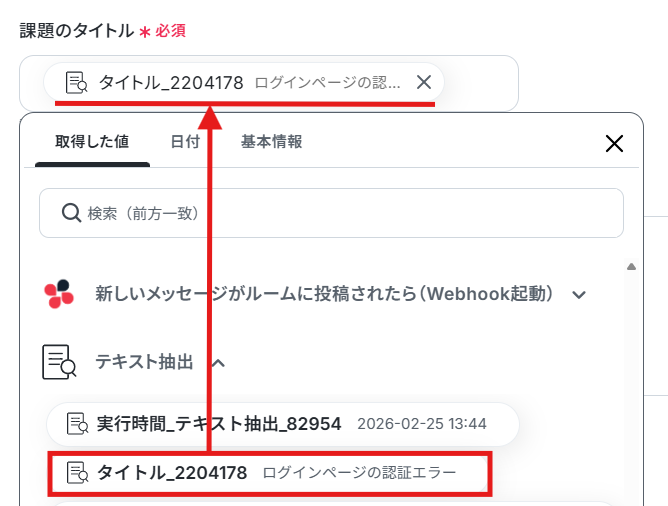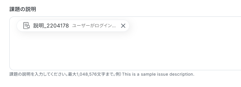 課題のタイトルは、Chatworkのメッセージ本文から抽出した「タイトル」が自動で引用できるように設定されています。