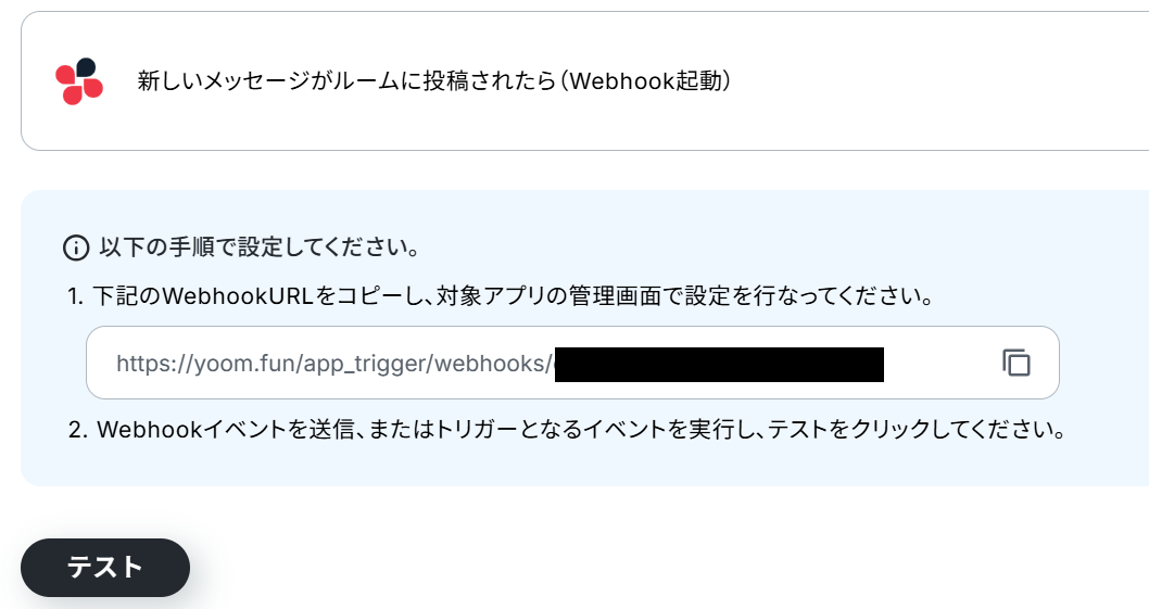 Webhookの設定を行います。 表示されているWebhook URLをコピー後、Chatworkの画面を開いてください。