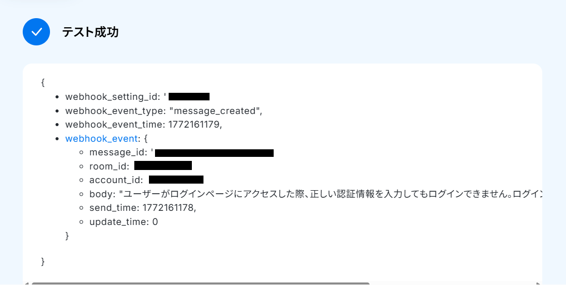 続いて、トリガーの動作テストを行います。 Chatworkにテスト用のメッセージを作成しましょう。 ※Webhookで指定したルームIDのルームに必ず送信してください。