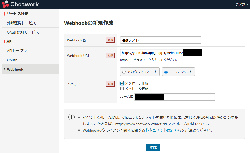 Webhook URL欄には、先ほどYoomの画面でコピーしたURLを貼り付けます。 イベントは、「ルームイベント」を選択し「メッセージ作成」にチェックしてください。 使用したいルームIDを設定し「作成」ボタンを押したら設定完了です!ChatworkのルームIDの確認方法 Chatworkのwebhookを使ってアプリトリガーを起動する方法