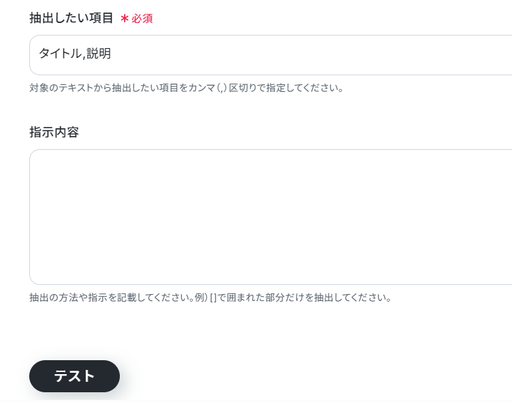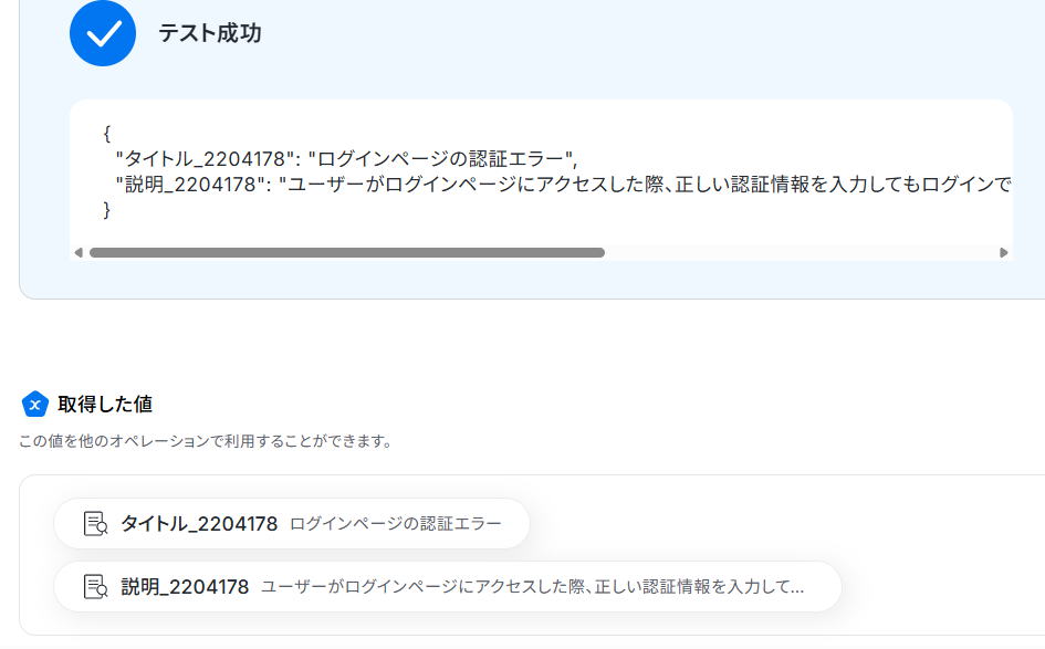 テストが成功すると、「取得した値」に抽出された結果が表示されます。 正しく抽出されていることを確認し、設定を完了してください。