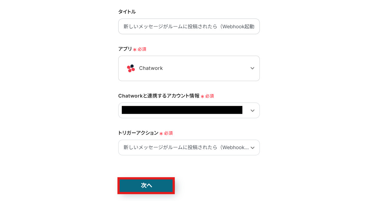 Chatworkと連携するアカウント情報は、プルダウンから選択します。