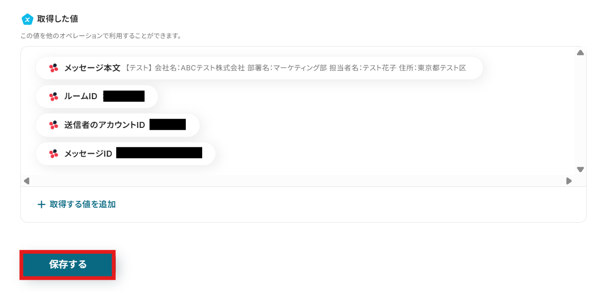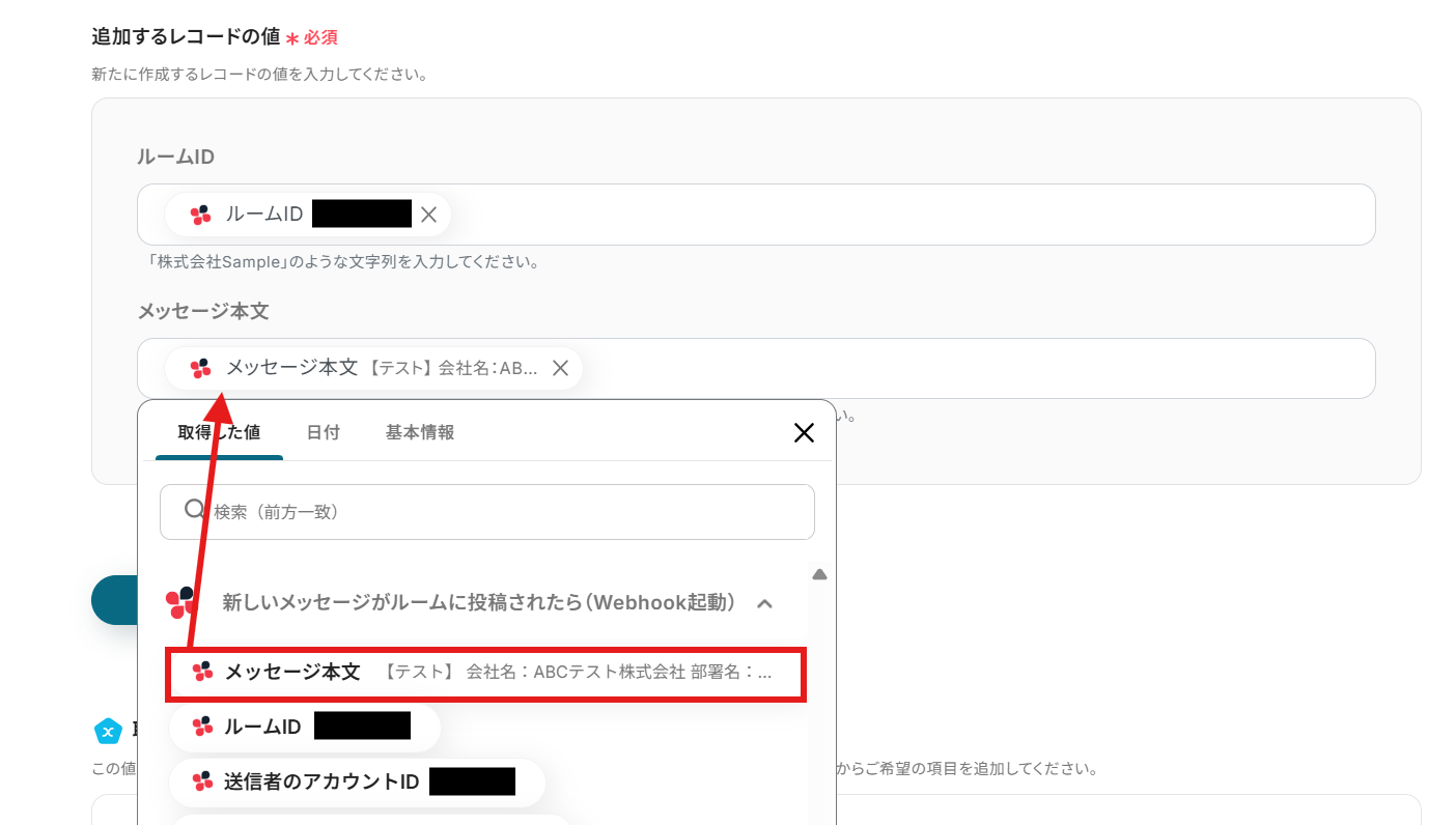 各項目をクリックすると、Chatworkで取得した値を引用できます。