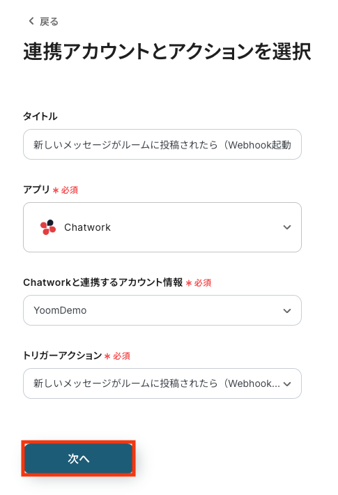Chatworkと連携するアカウントは、マイアプリ連携したものが反映されています。トリガーアクションが「新しいメッセージがルームに投稿されたら」であることを確認し、「次へ」をクリックします。