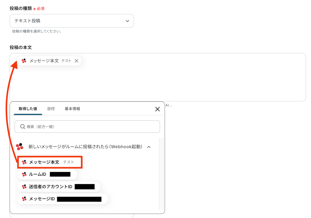 入力欄をクリックし、前段で取得したアウトプットを挿入したり、任意のテキストを組み合わせるなど自由に設定可能です。
