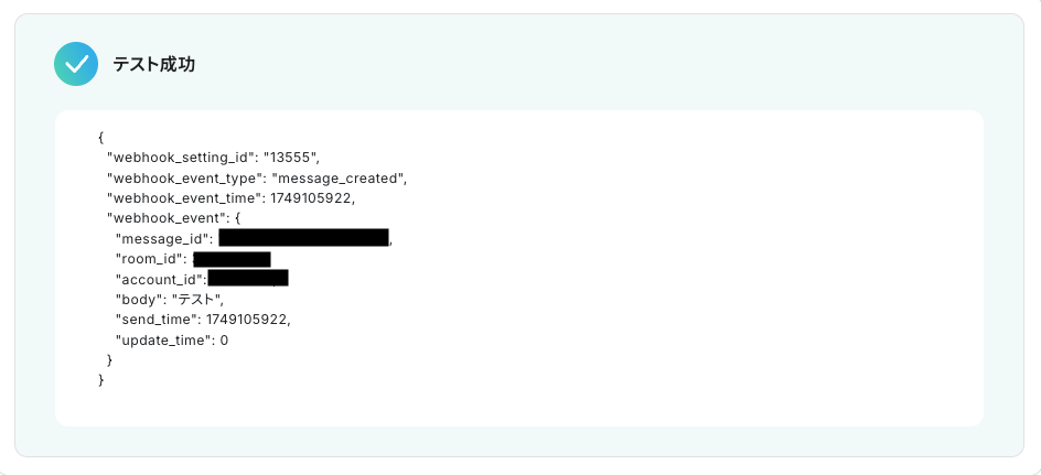 テストが成功すると、先ほどChatworkに投稿したメッセージの情報がアウトプットとして表示されます。