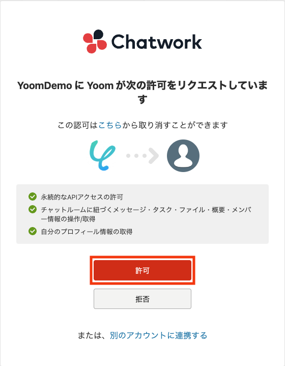 ログイン後、YoomがChatworkとの連携に必要なアクセス許可を求める画面が表示されます。