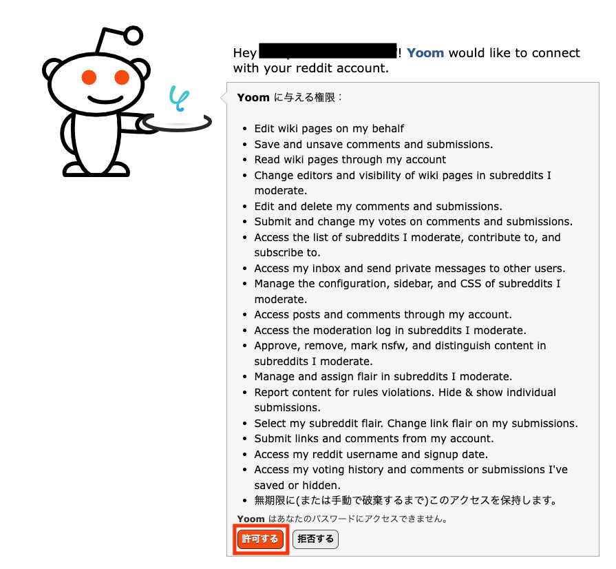 この画面では、YoomとRedditアカウントの連携に必要なアクセス許可の確認が行われます。