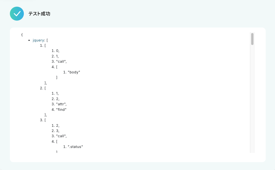 すべての設定が完了したら、「テスト」をクリックします。テストが成功すると、以下の通り投稿が正常に処理されたことを示す結果が表示されます。