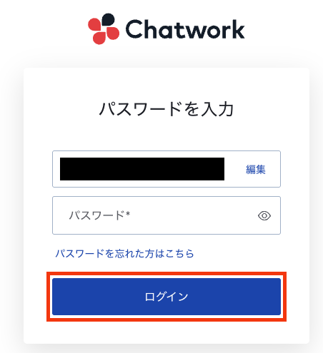 Chatworkのログイン画面が表示されたら、登録済みのメールアドレスを確認し、パスワードを入力します。