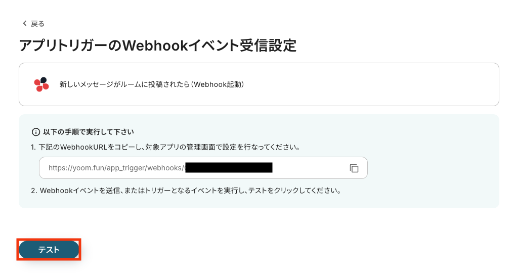 Yoomの操作画面に戻り、「テスト」をクリックして連携ができているか確認します。