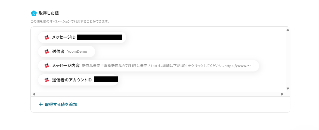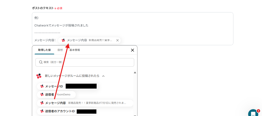 Chatworkに送信した情報が取得した値(アウトプット)に表示されます!