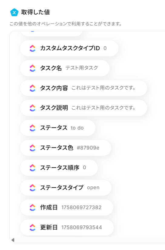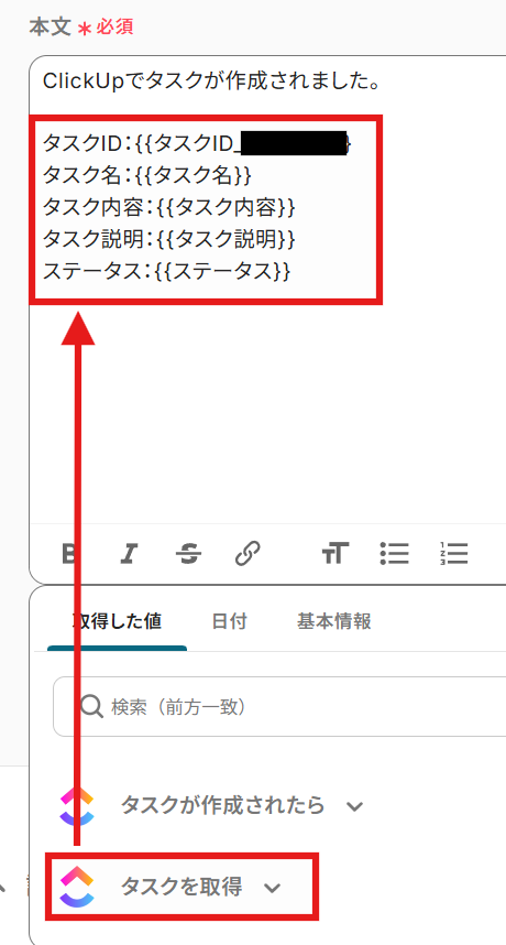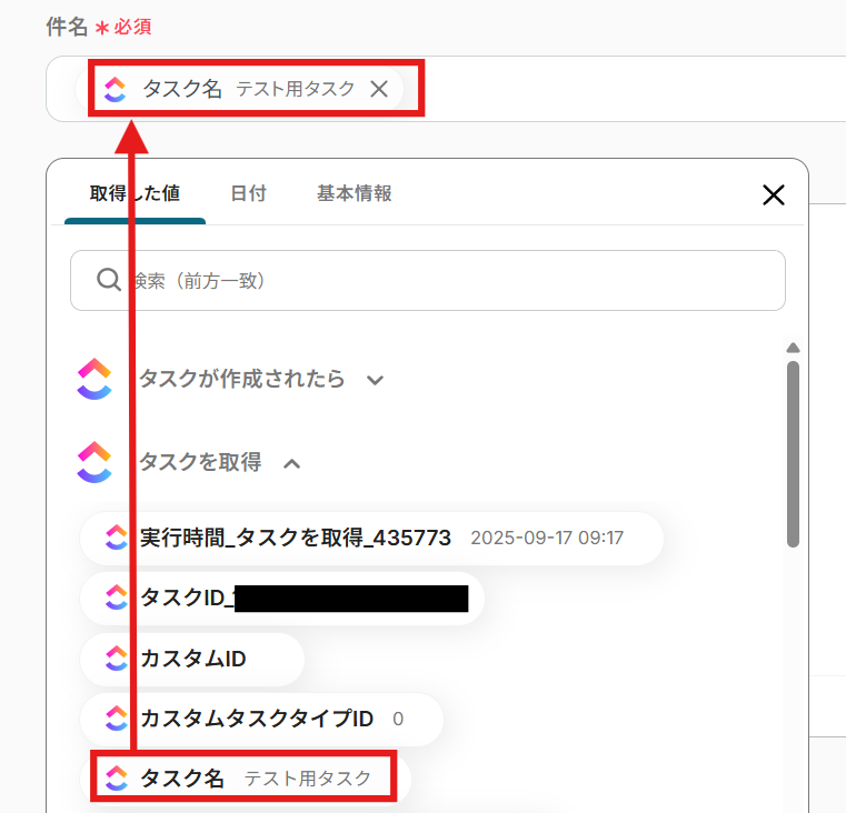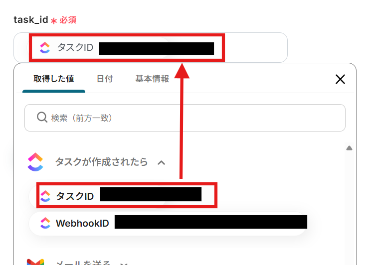 「task_id」は入力欄をクリックすると取得した値が表示されるので、その中から選択します。