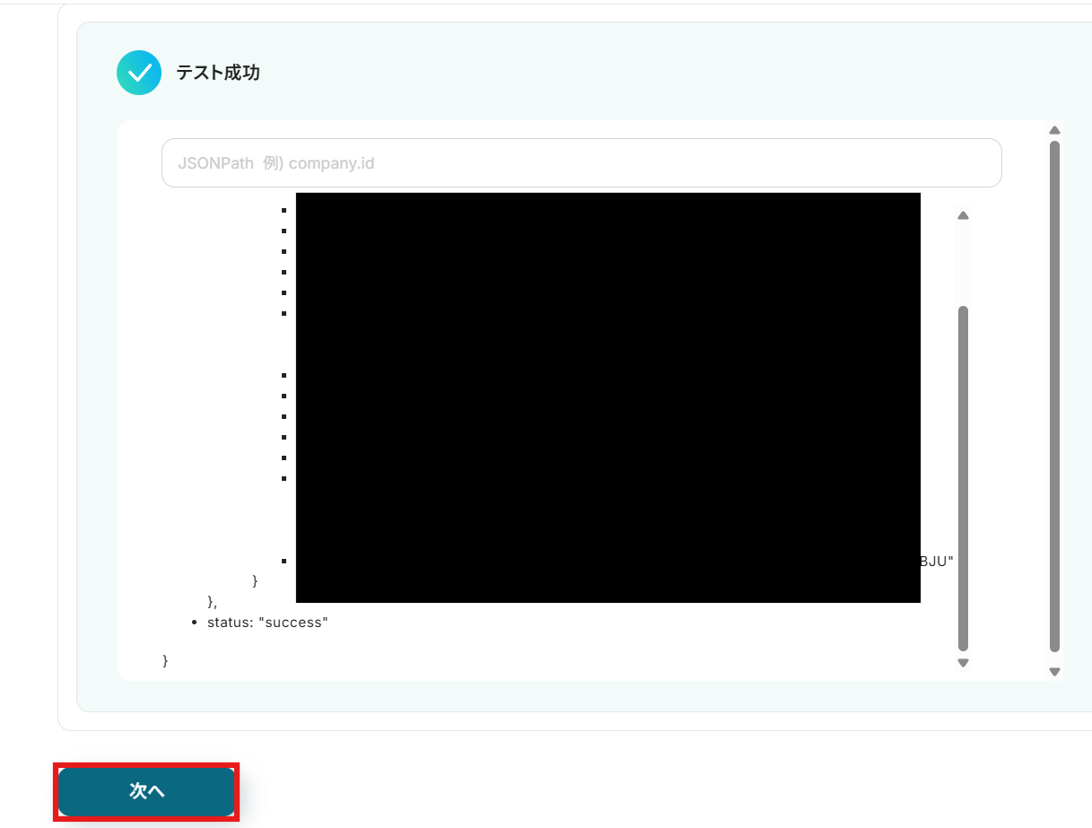 テストが成功したら、値が取得されます。この取得した値は後のフローで使用します。