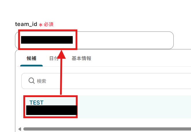 「team_id」は入力欄をクリックすると候補が表示されますので、その中から選択します。