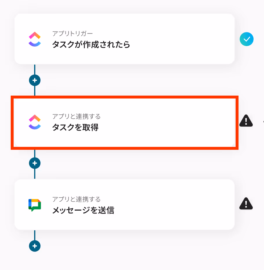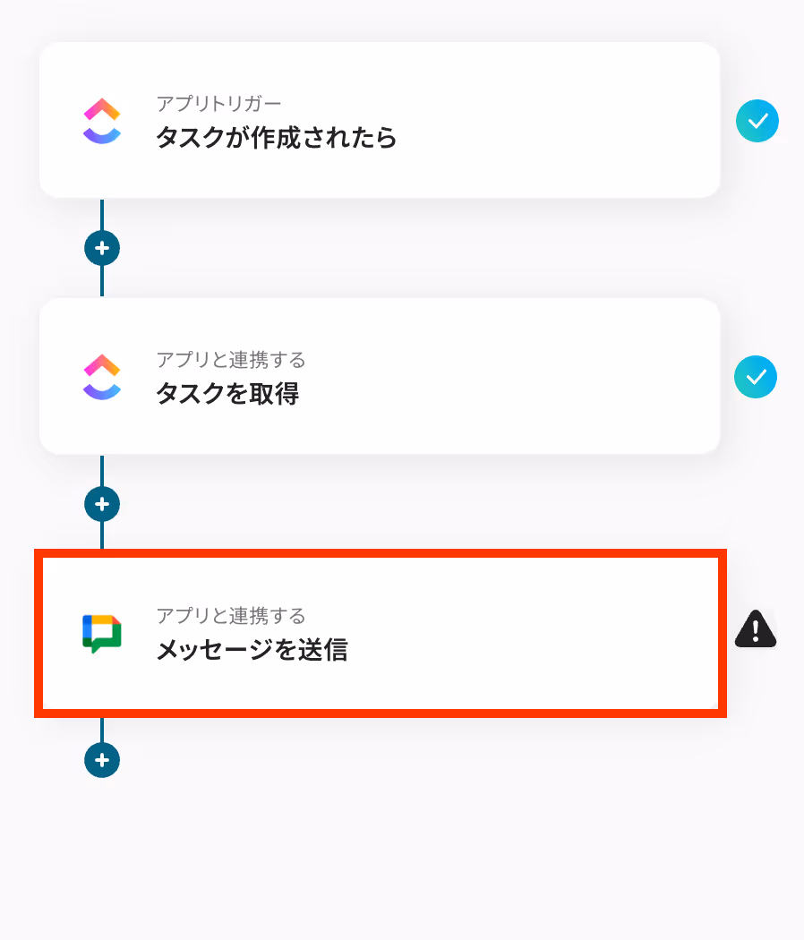 ClickUpで作成されたタスクの中から、特定の条件に合致するものだけをGoogle Chatに通知する連携です。
