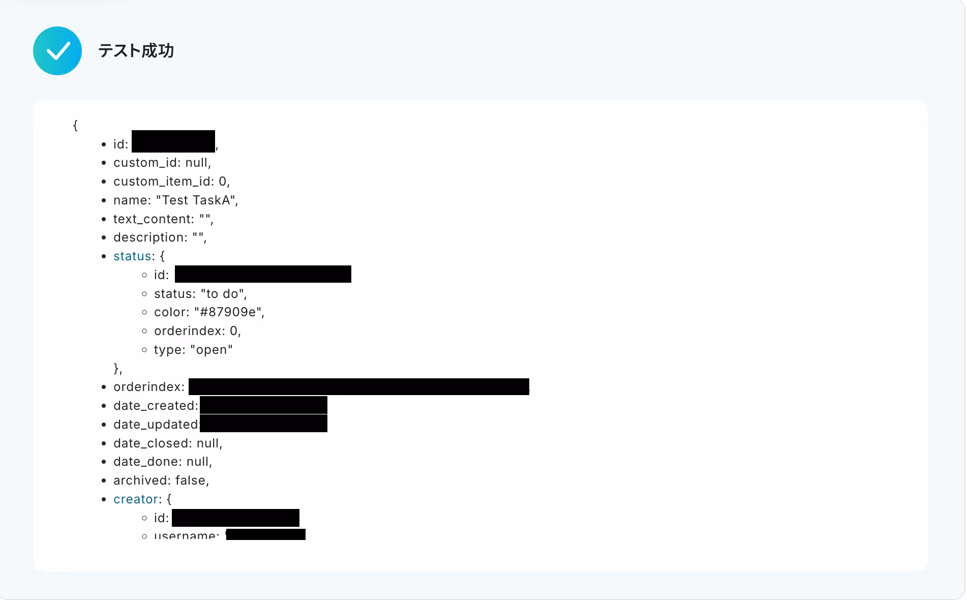 テスト成功と表示されたら、「ClickUpでタスクが作成されたときに通知を受け取る設定(Webhook)」が正常に登録・接続されていることを示しています。
