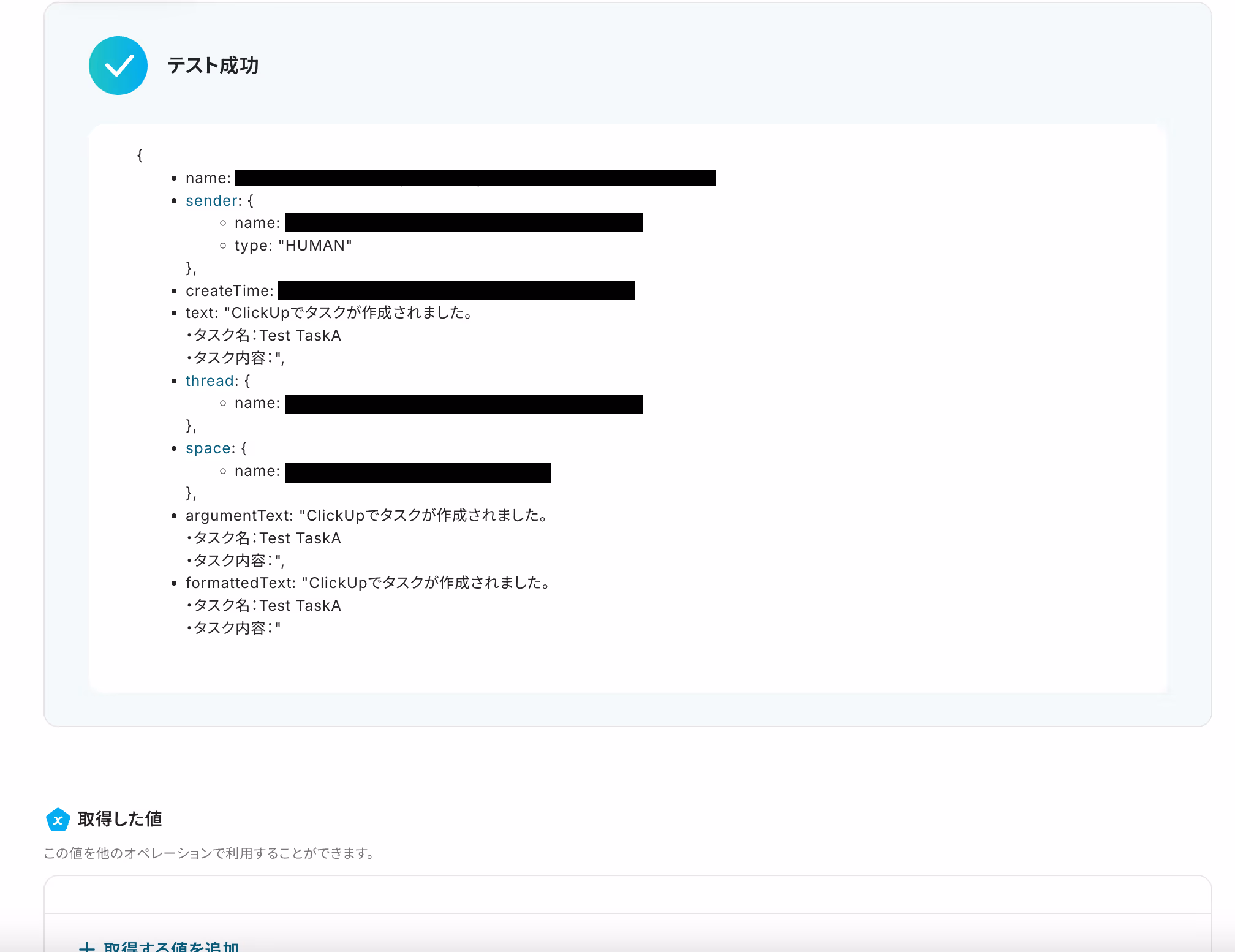 「テスト成功」と表示が出たら、取得した値が取得されます。