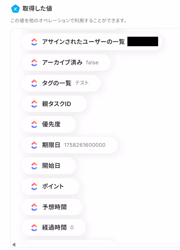 A:タスクを取得するアクションで、タグや優先度、開始日など、取得した値として表示されている項目が連携可能です。