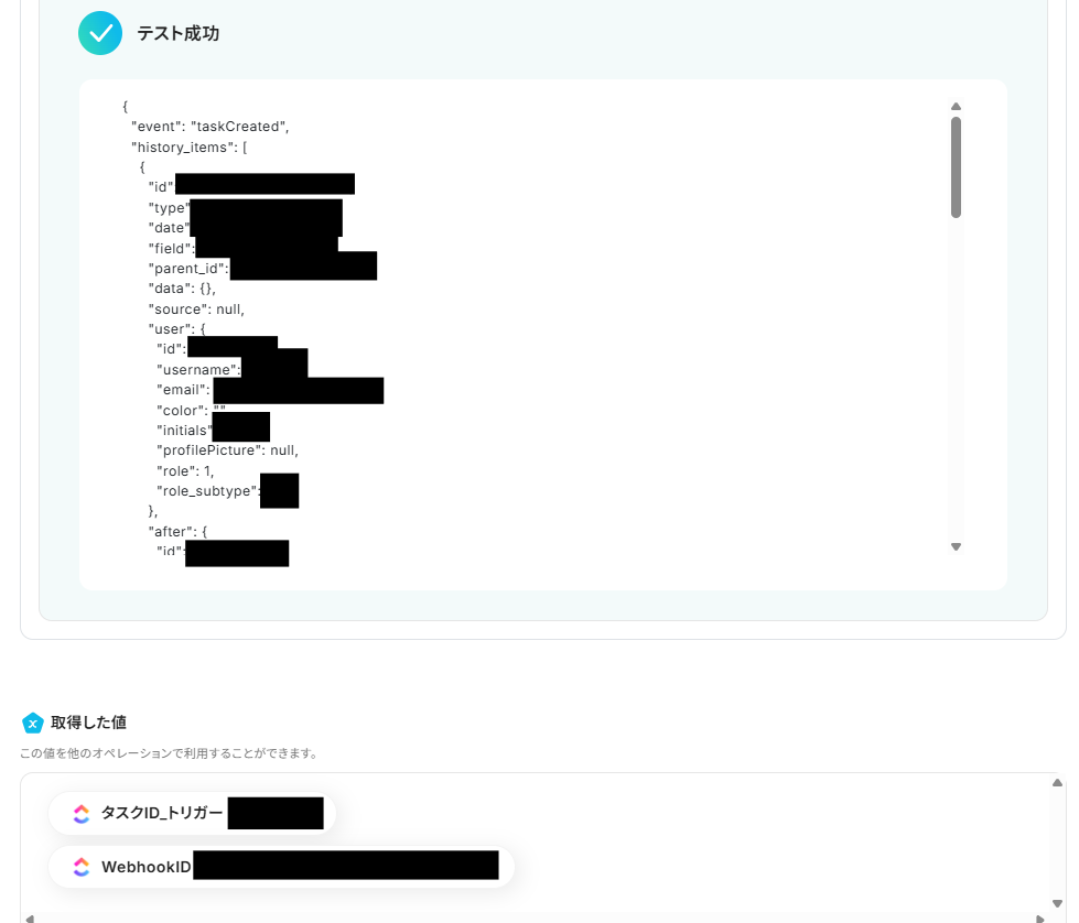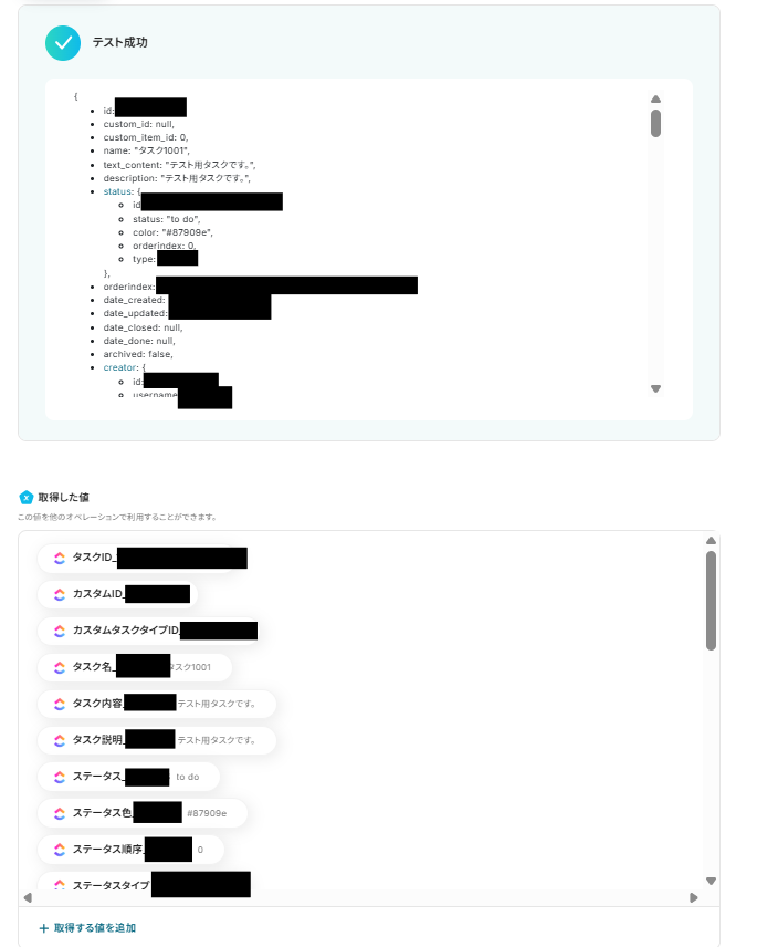 「取得した値」は変数となるので、ClickUpでタスクが作成される度に最新の値を引用できます。