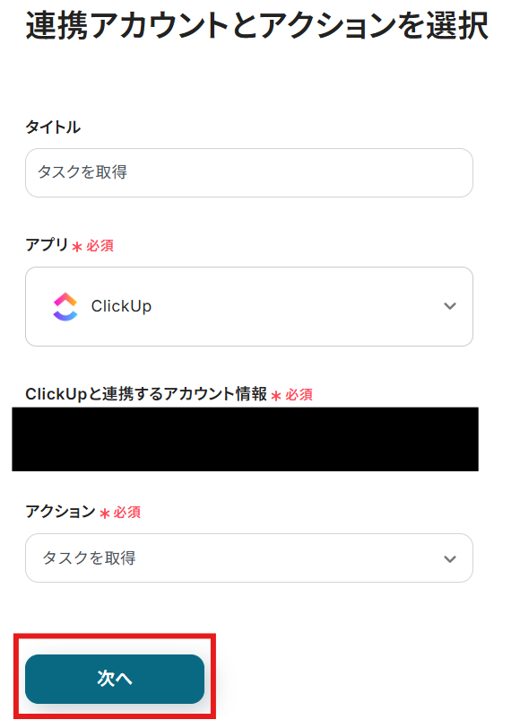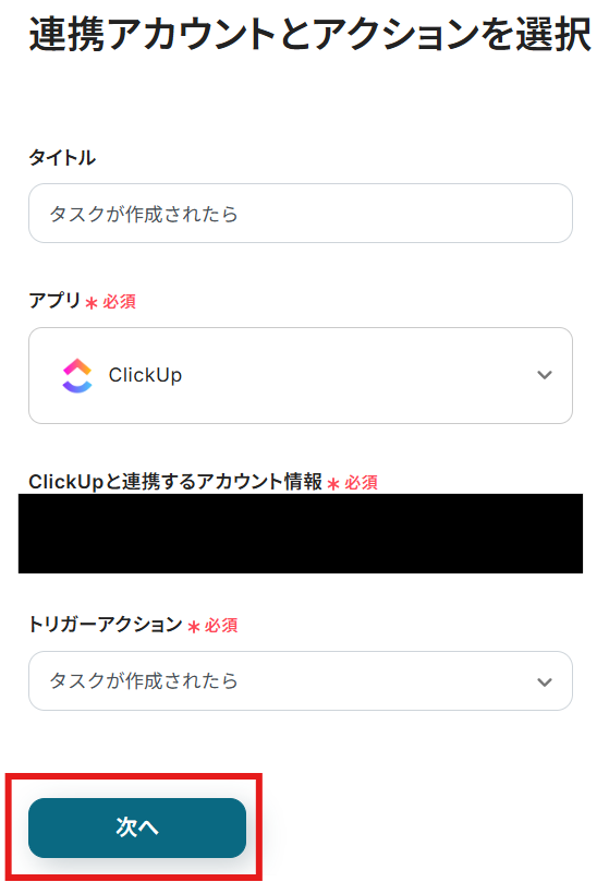 タイトルと連携するアカウント情報を確認し、アクションはテンプレート通りのまま「次へ」をクリックして進んでください。