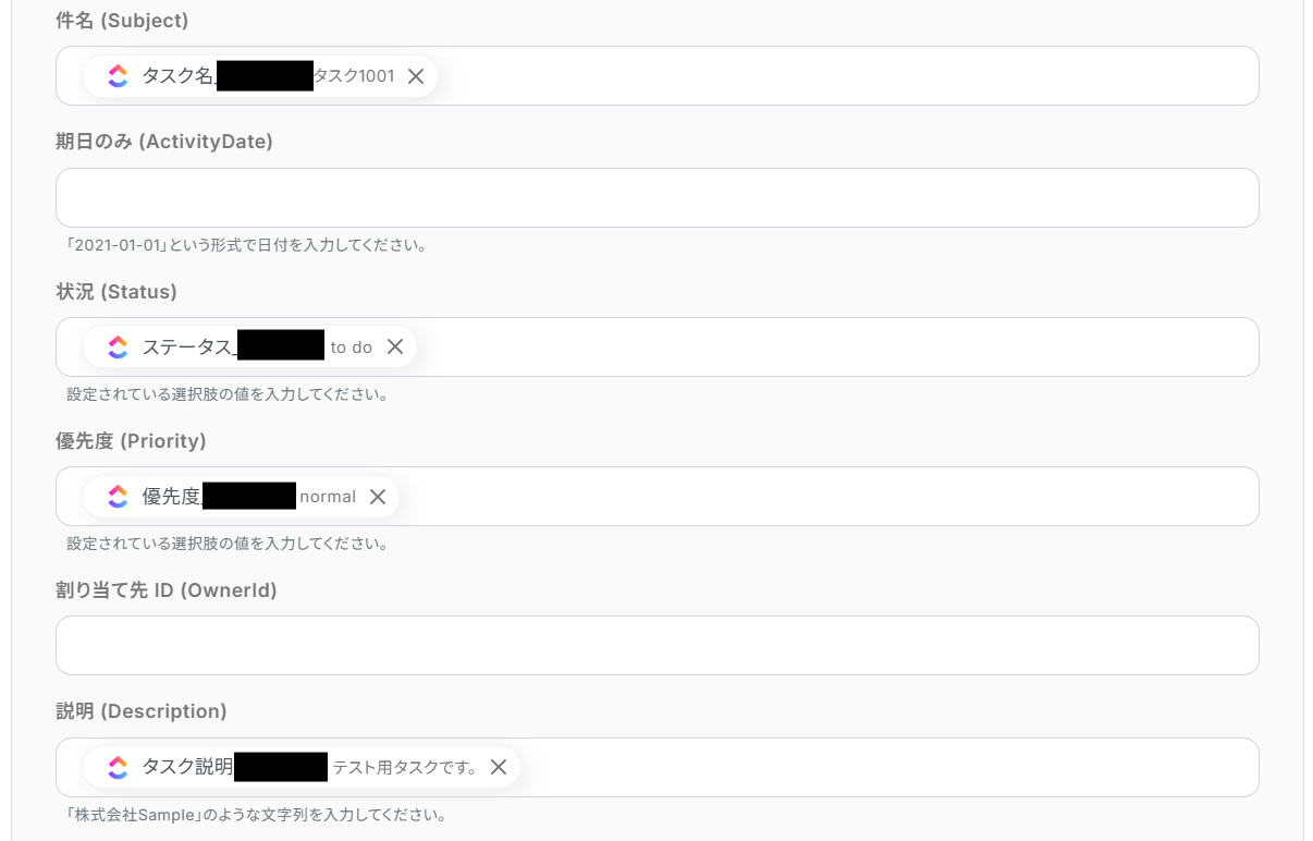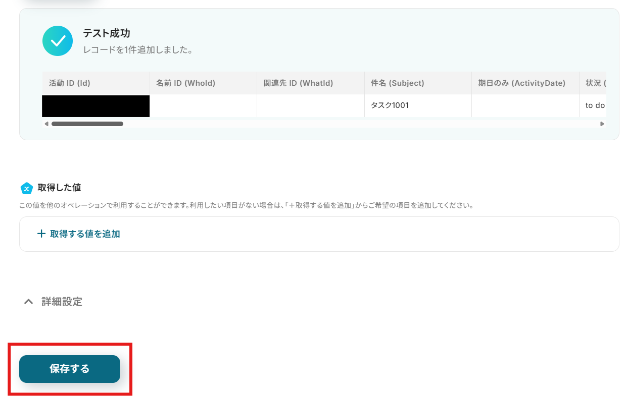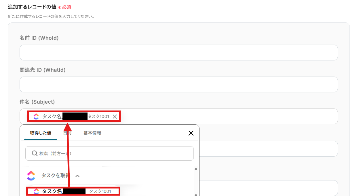 取得したタスクの内容を使って、Salesforceにレコードを追加します。