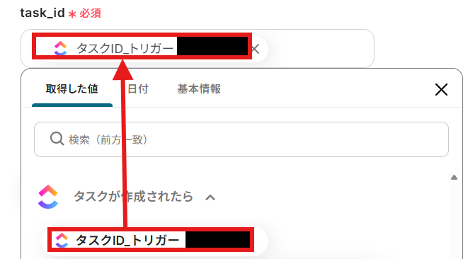 ClickUpの「task_id」を「取得した値」から設定しましょう。