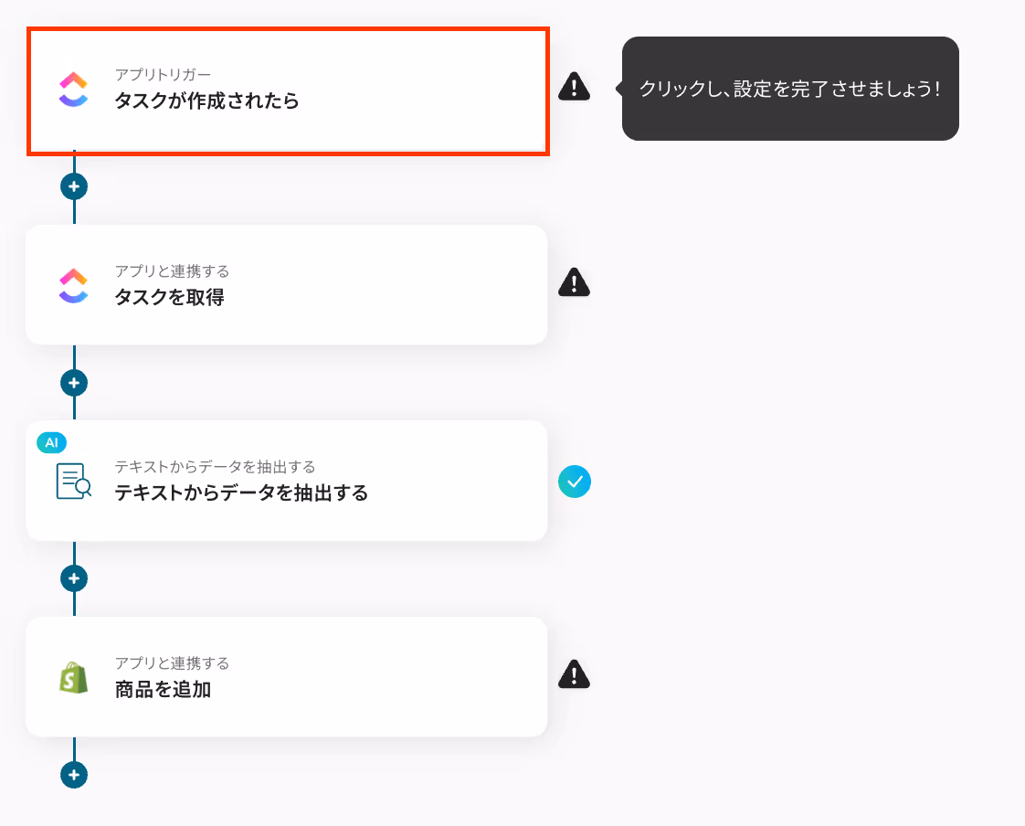 続いて、ClickUpで作成されたタスク内容を基に、Shopifyに商品を自動追加する設定を行います。