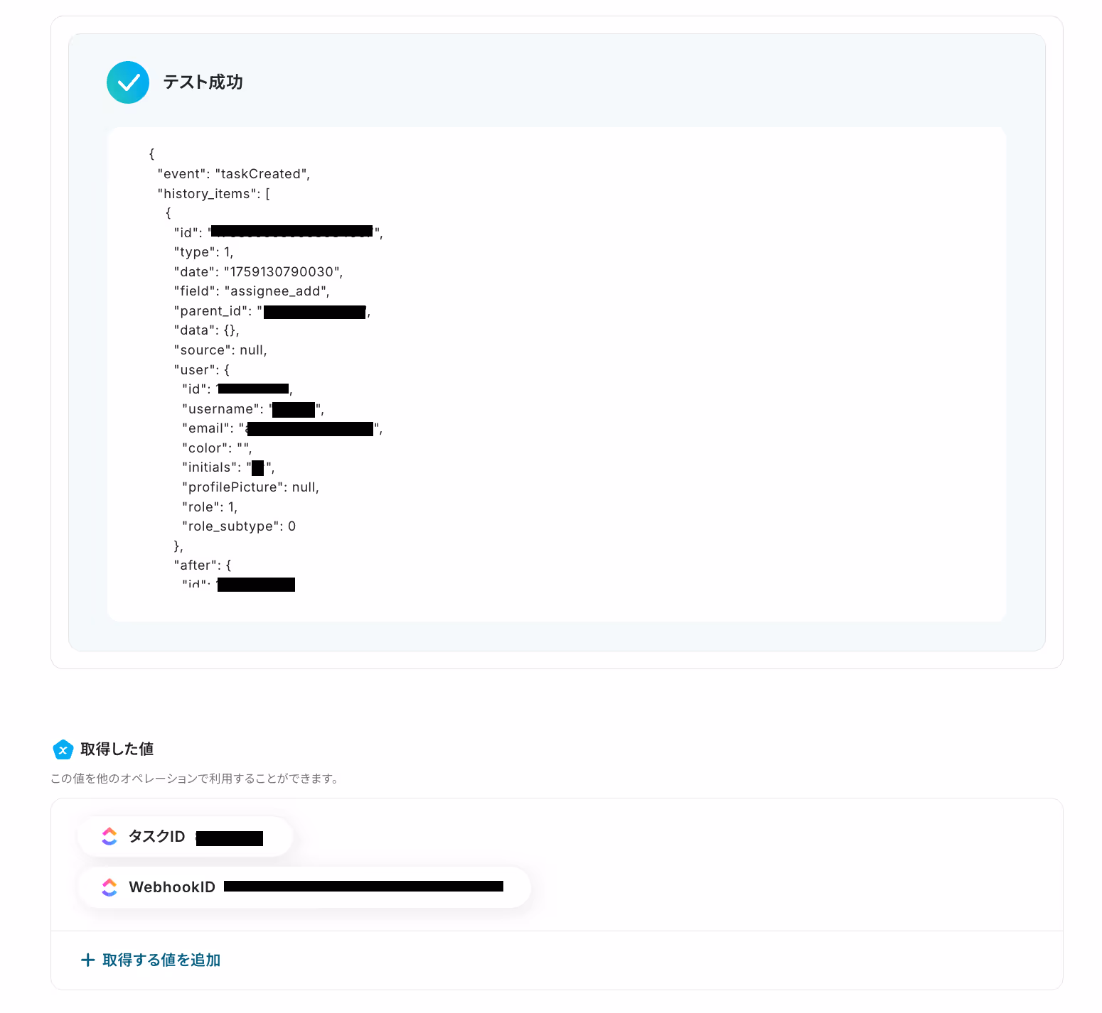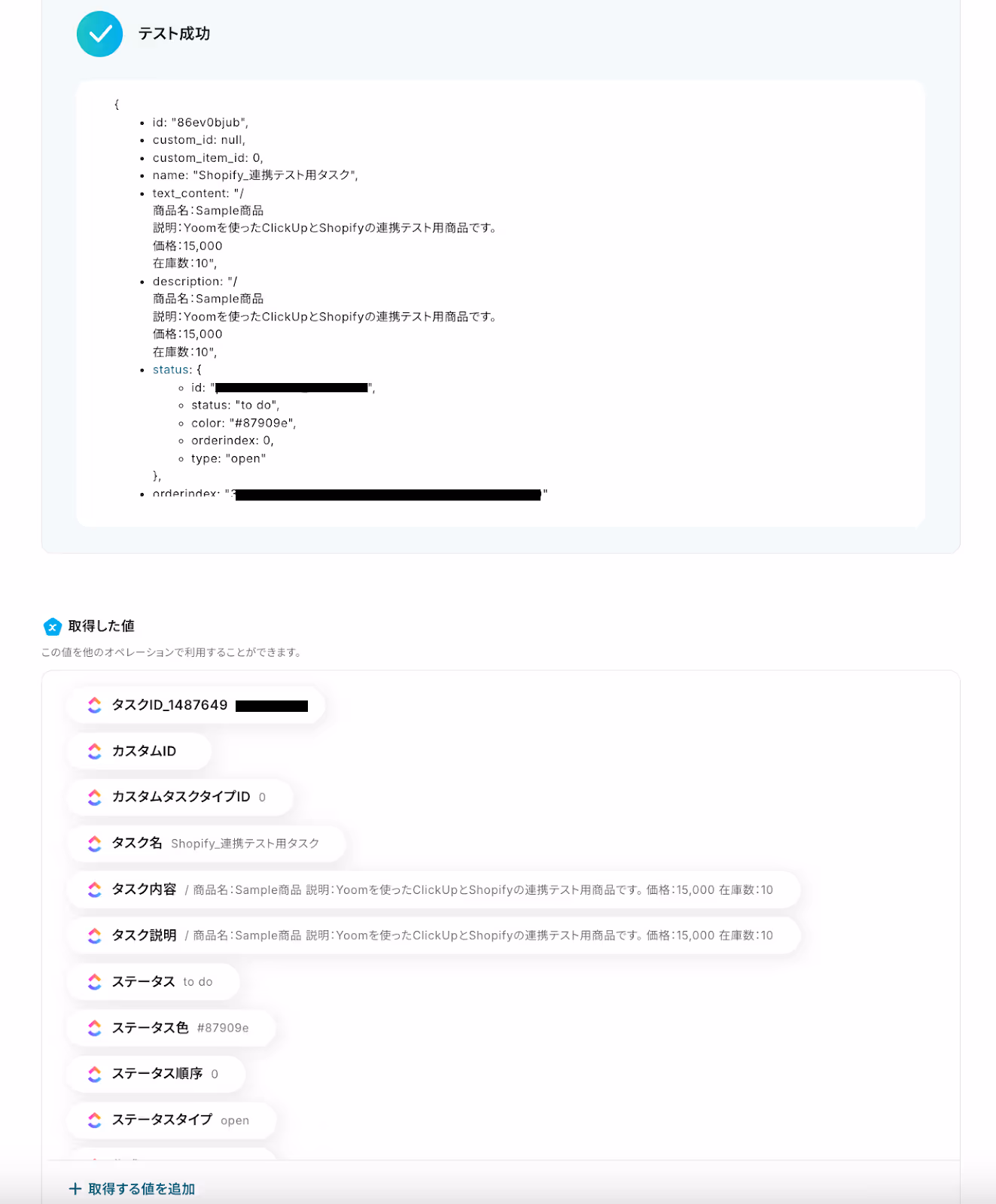 テストが成功すると、先ほど作成したタスクの情報が「取得した値」として抽出されるので、内容を確認しましょう。